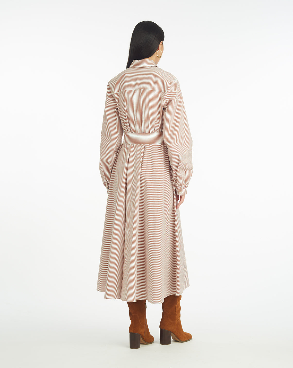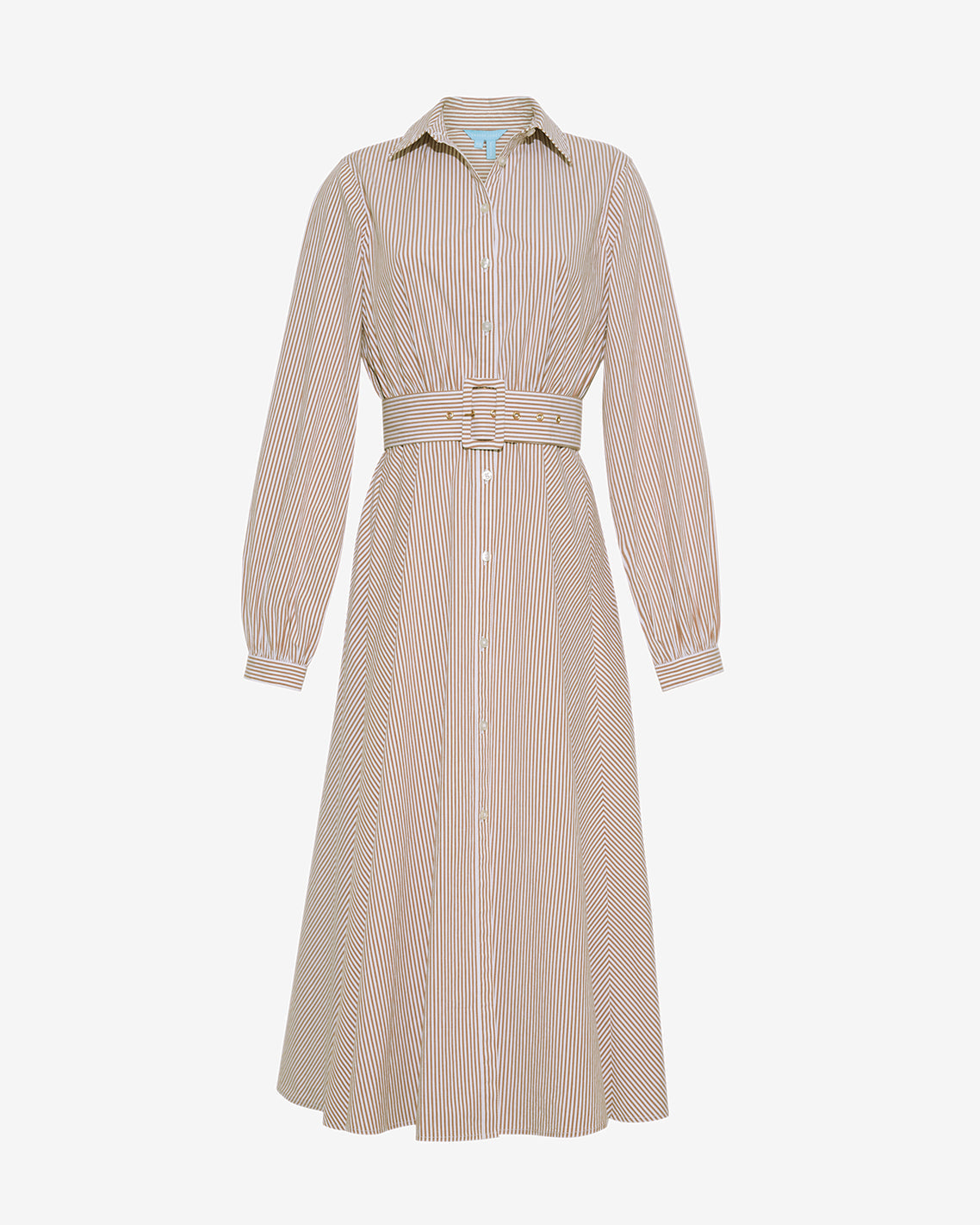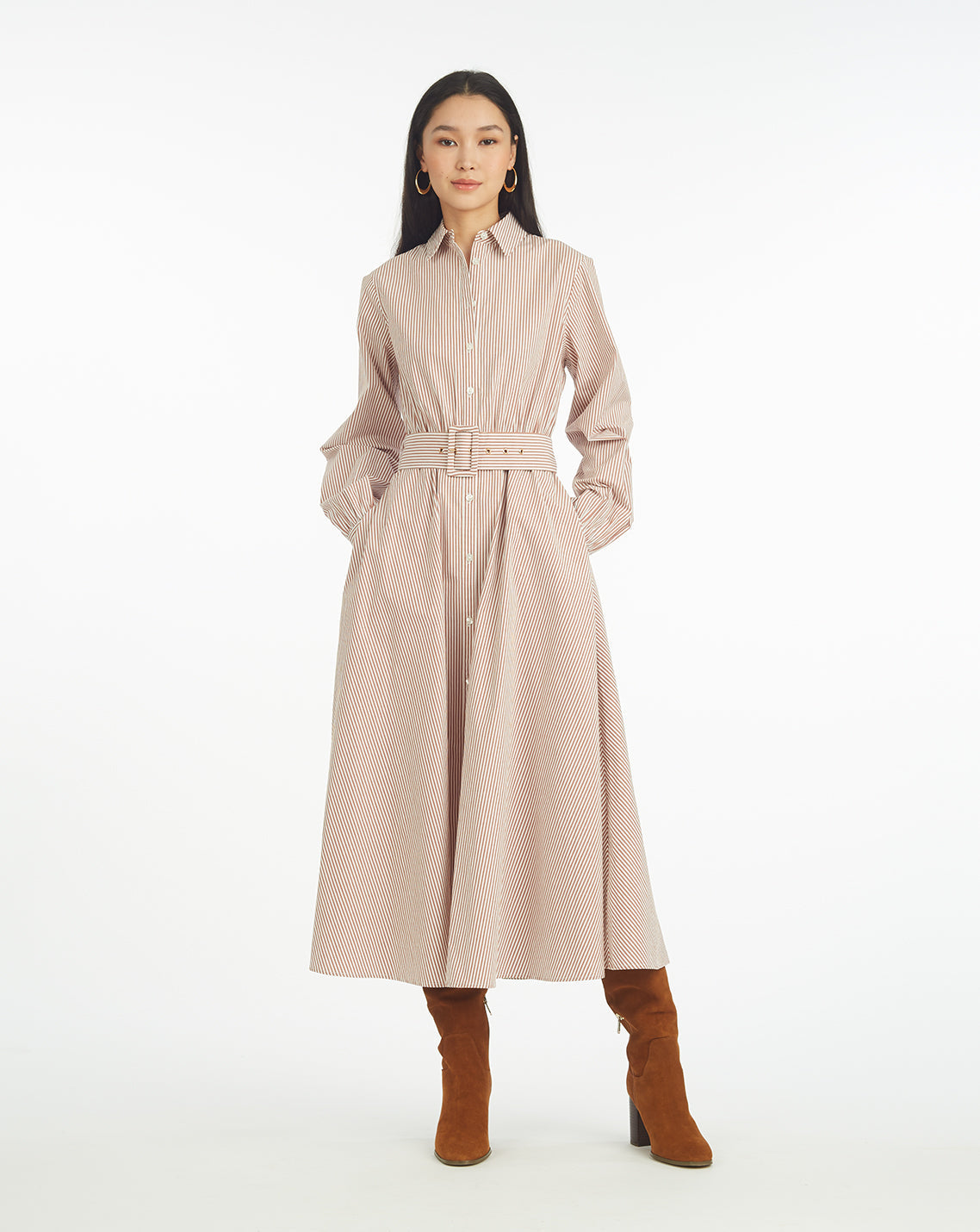 The Eliza midi shirtdress crafted from crisp stretch shirting, this polished midi features a collared neckline, button-front placket, and full-length sleeves with button cuffs. A matching belt cinches the waist for a flattering silhouette, while the A-line skirt brings soft movement and all-day comfort. Pair with flats for the office or add heels and a bold earring for an elevated dinner look.