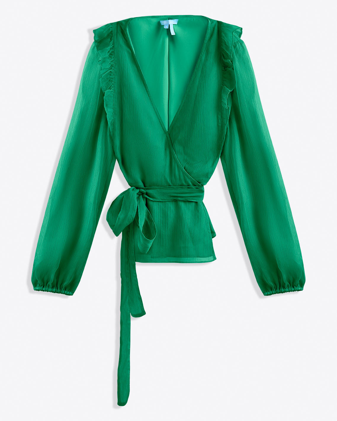 The Wrap Top is a chic and versatile blouse featuring delicate ruffle accents, a tie-waist detail, and sheer, billowy sleeves. Its elegant design transitions effortlessly from day to night — pair it with a skirt for a polished look, or style it with jeans for a casual yet sophisticated vibe. Perfect for any season, layer it under a blazer in cooler weather or wear it on its own for a breezy, feminine statement.